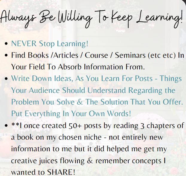 Being willing to ALWAYS learn and grow not only keeps us ahead of the game but also ensures that our content remains fresh, engaging, and connected to our specific niche and offer.